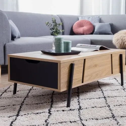 The Lamoda coffee table combines elegance and practicality in a single design. Made from natural wood to ensure quality and durability, this table is not only a beautiful addition to your home but also provides practical storage space. With its stunning wood color and distinctive black details, it will add a unique touch to your living room, adding vibrancy and elegance.