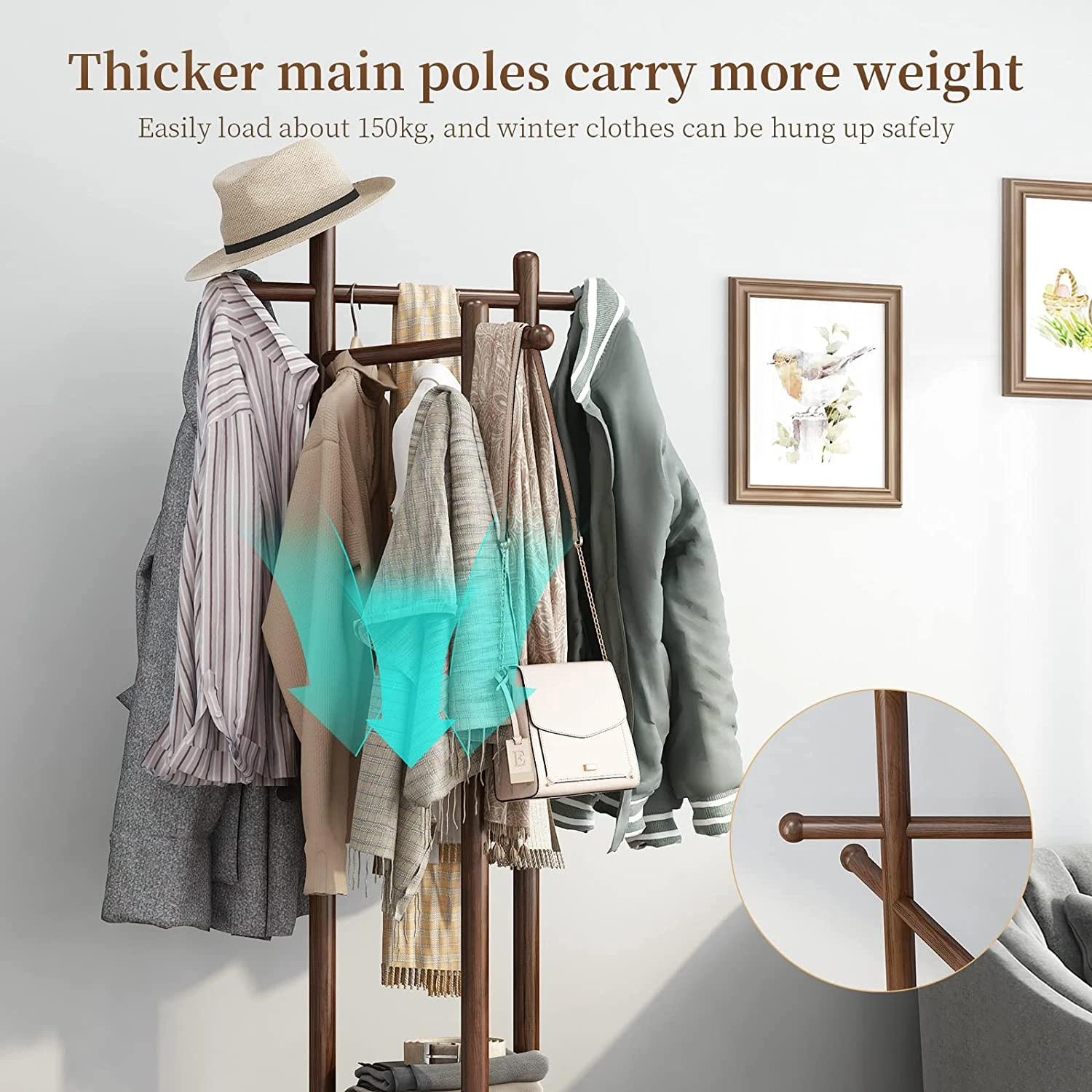 2. 6 STURDY HOOKS: It has 6 strong hooks for hanging heavy clothes and bags, and can hold up to 100 kg, making it ideal for clothes or large items.