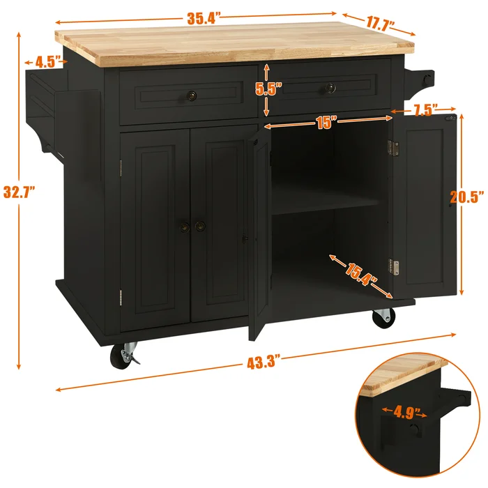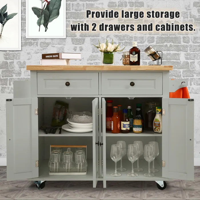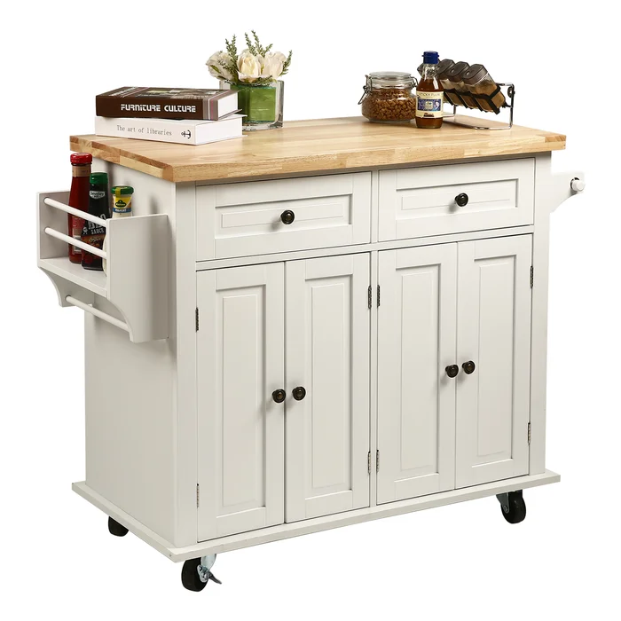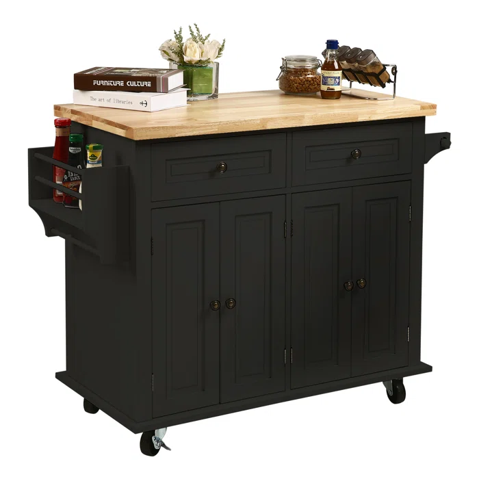 This kitchen island will double your storage space, making your kitchen more organized. It also provides ample prep space and keeps all your cooking tools within easy reach, thanks to its spice rack, towel rack, two drawers for storing dishes and utensils, and two spacious drawers. It’s easy to move thanks to the wheels on the bottom.