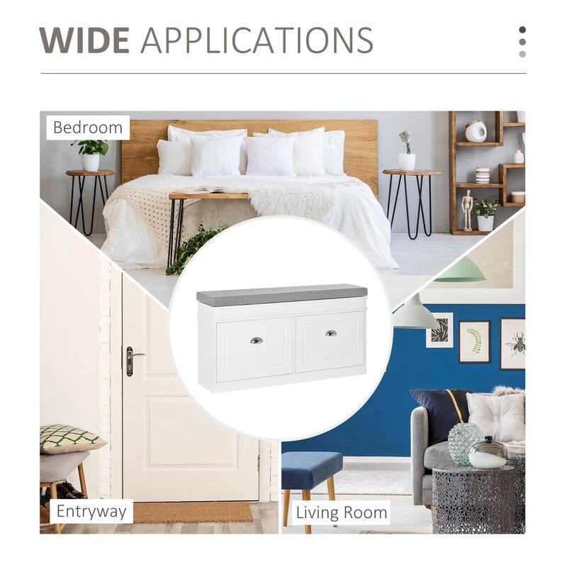 The Berry shoe storage bench has two drawers, each of which can hold four pairs of shoes. If you need to rearrange the storage space, each drawer has an adjustable shelf.