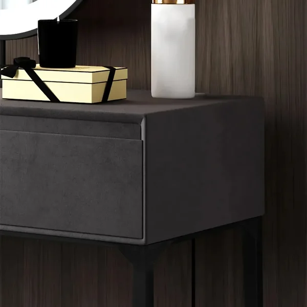 With this elegant dresser, you can start your day in the best possible way. It’s crafted from natural wood to ensure long-lasting use and durability. The tall black legs add a touch of luxury, while the gray velvet top creates a minimalist look that easily blends with any modern design. The dresser offers ample space for storing cosmetics, jewelry, and other everyday items on its large surface, plus two drawers for additional storage.
