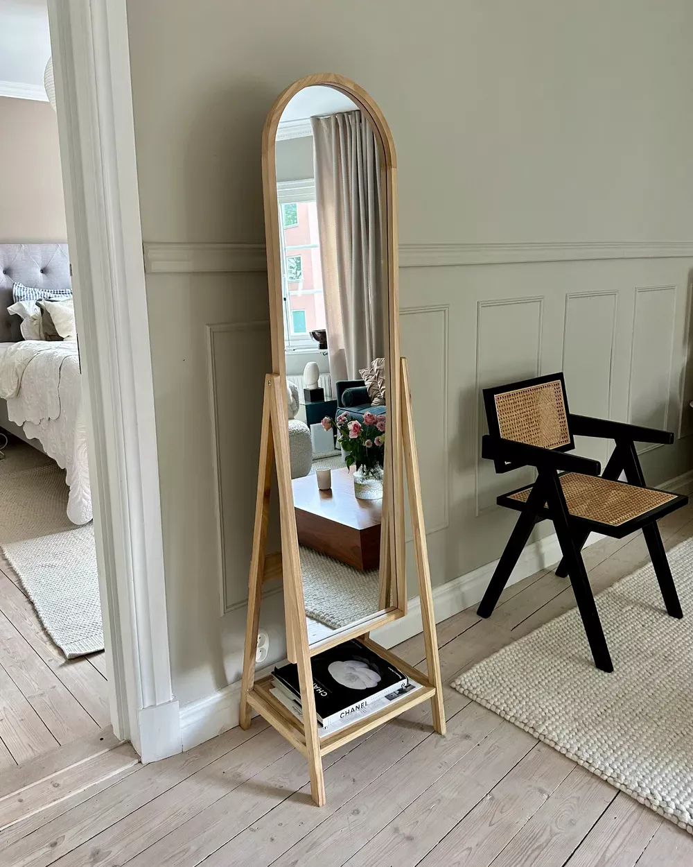 A key piece that combines the beauty of natural wood with smart functionality, this floor mirror with its natural wood frame adds a sense of warmth and comfort to any space. The mirror provides a clear, full-length reflection, making it ideal for everyday use, while its sturdy and balanced design ensures stability and safety during standing and use.