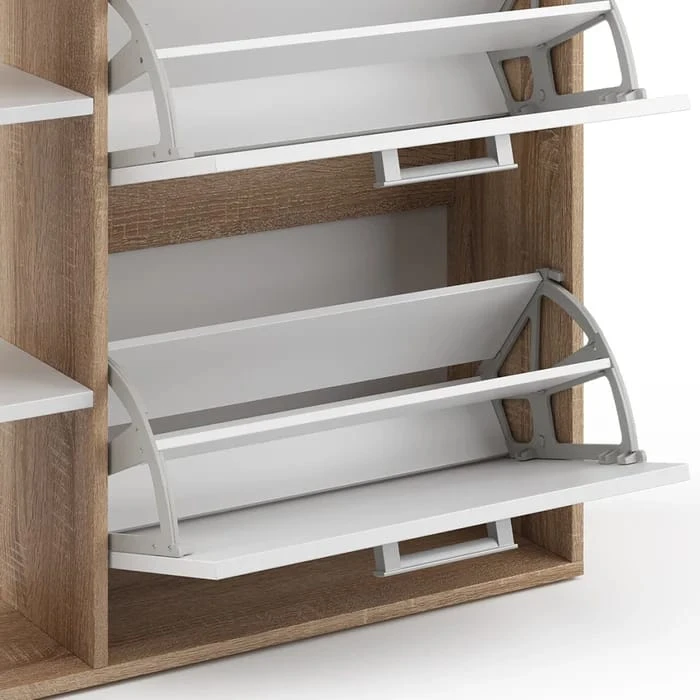 Keep your shoes neat and organized in one place with this distinctive shoe rack. Its contemporary design adds to your home decor, in addition to providing practical storage space. It features two flip-out drawers with a shelf in each, in addition to open side shelves.