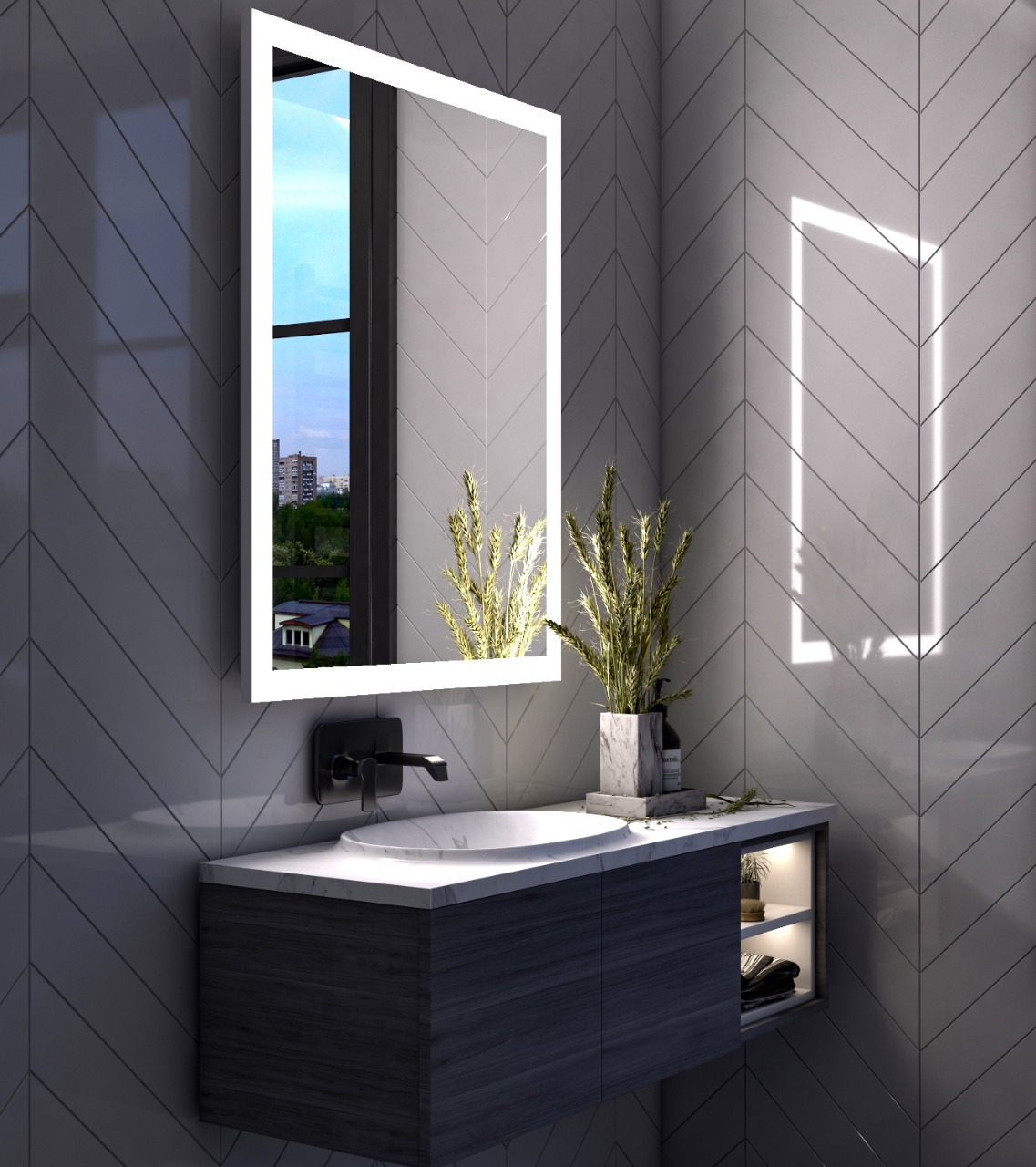 Tulin bathroom mirror with LED lighting and cabinet