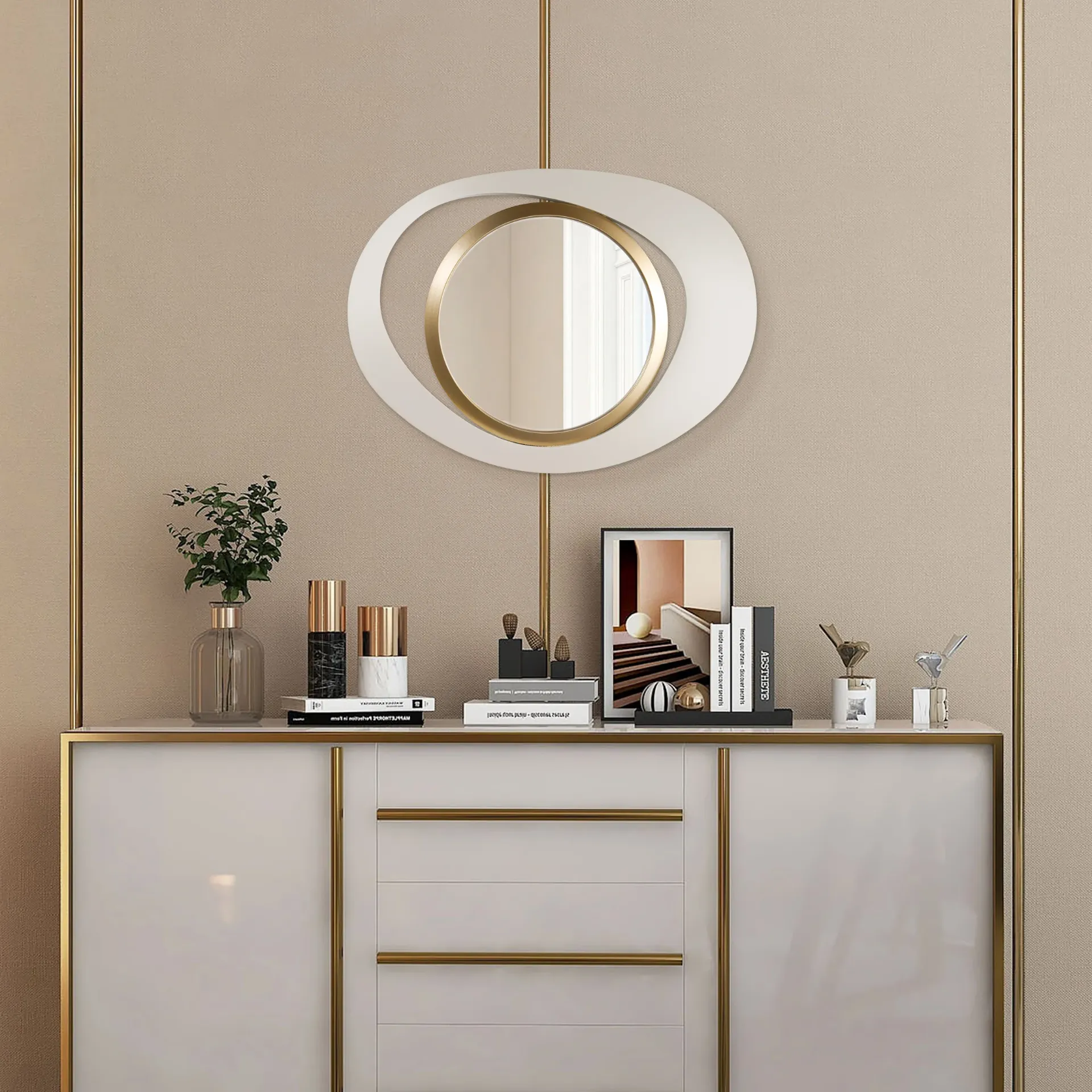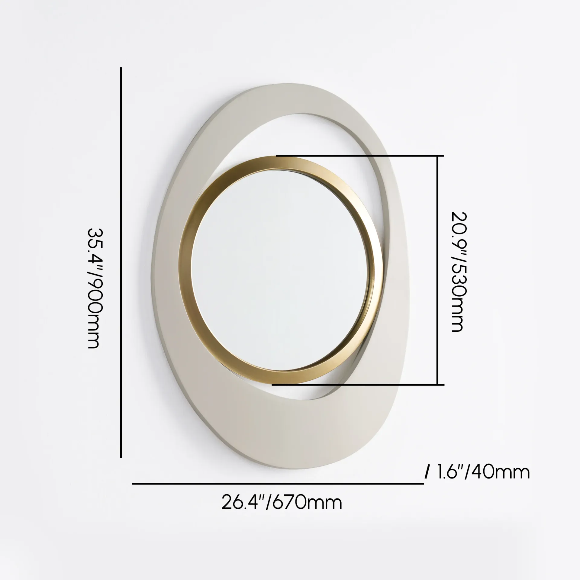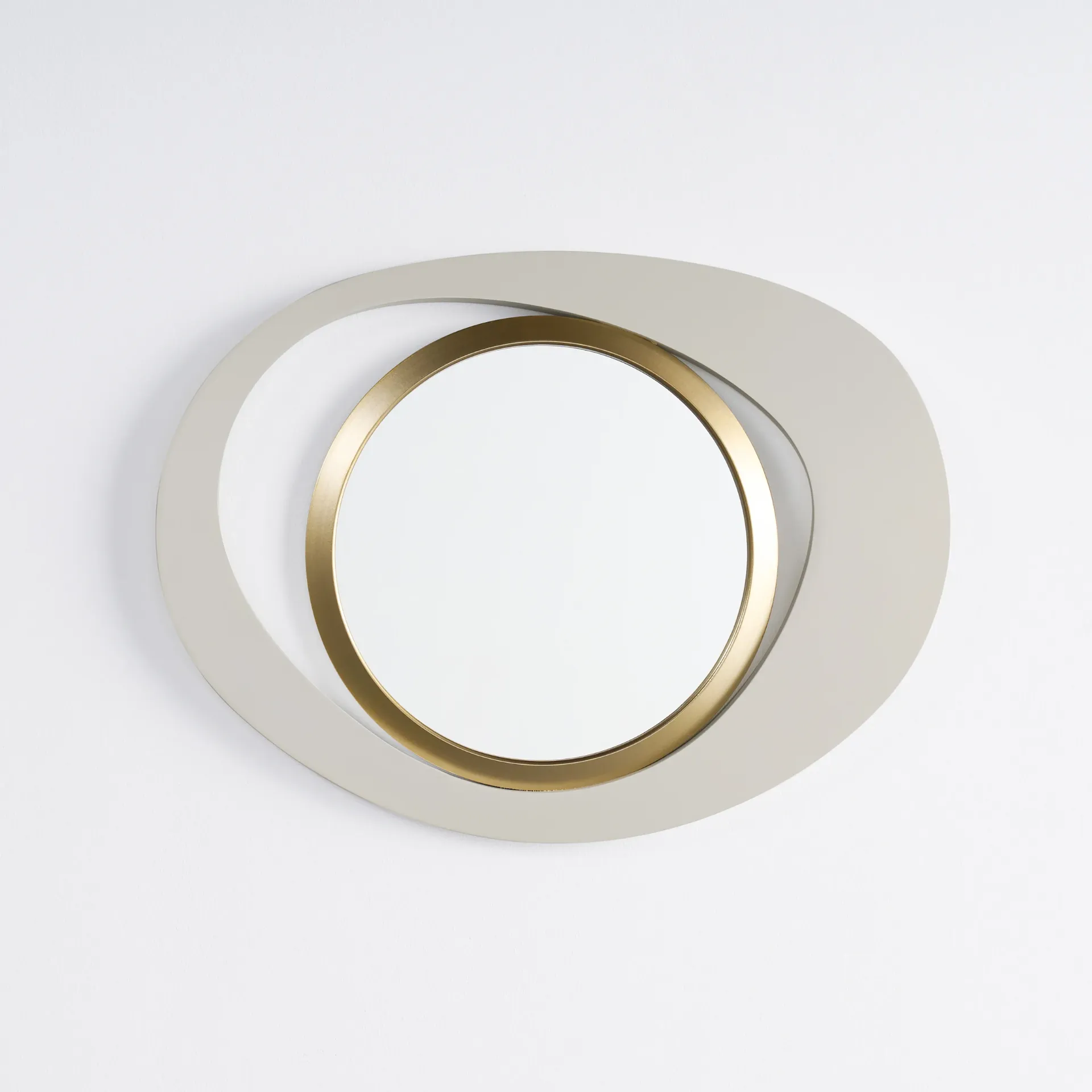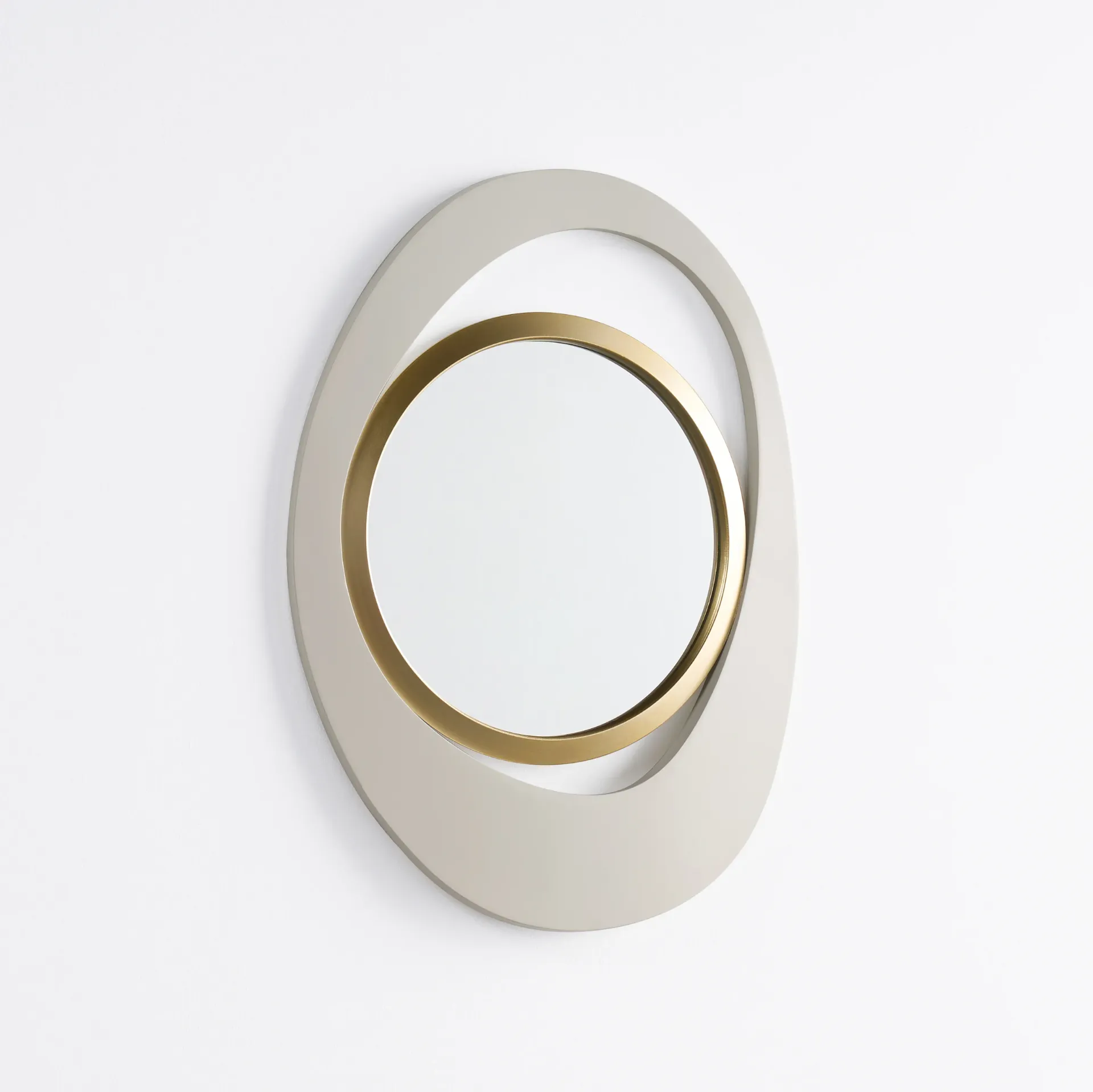 Add a touch of modern elegance to your home with the Orbit Luxe Wall Mirror. Featuring an asymmetrical frame that surrounds a stunning circular mirror with a gold rim that stands out at its center, this mirror gives it a design that combines modernity and artistry. With its sculptural shape, this piece adds depth and visual dimension, making it the perfect choice for living rooms, entryways, or bedrooms. Crafted from high-quality materials, this mirror provides a sophisticated touch that enhances the sense of space and elegance wherever it is placed.