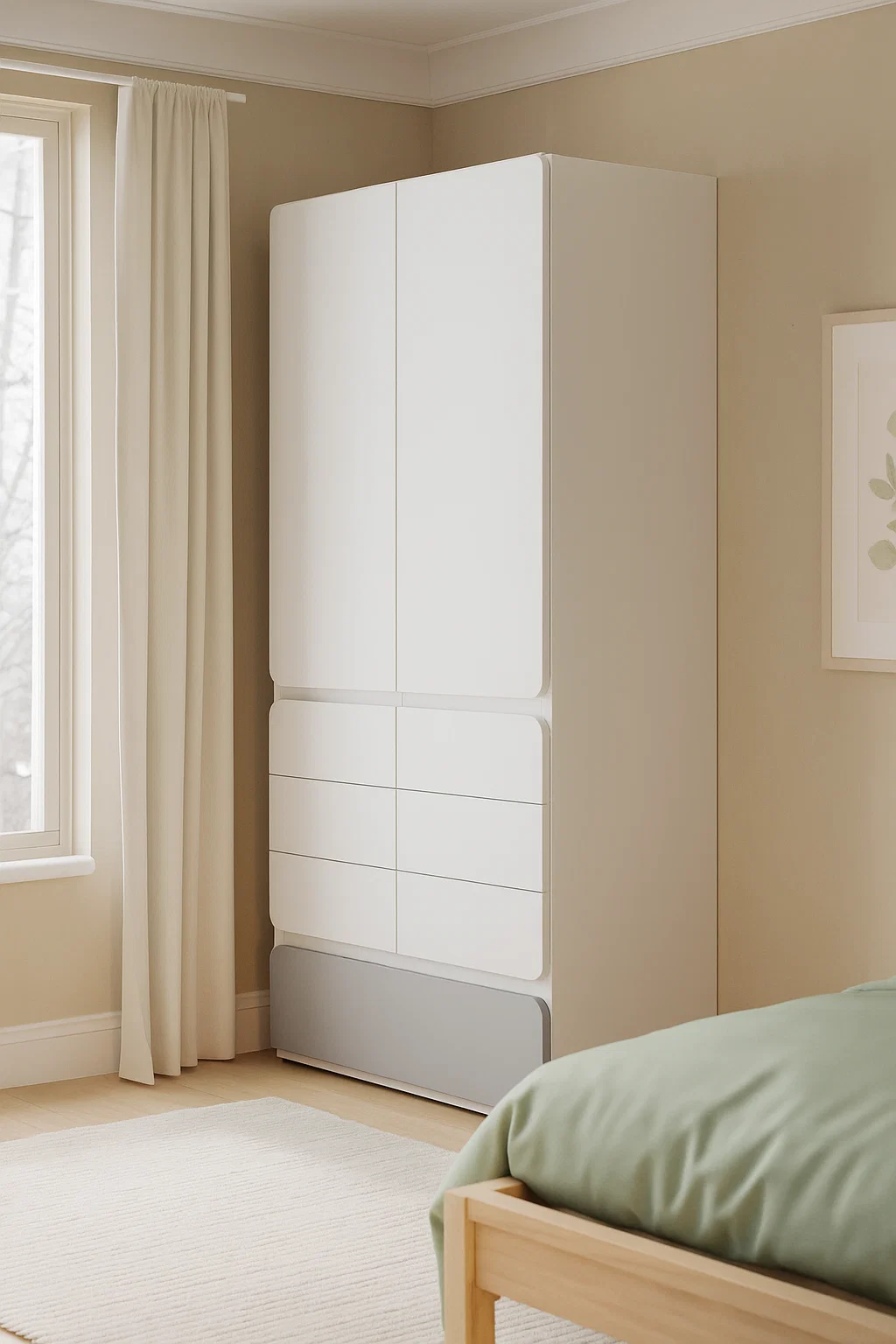 What makes the Oro wardrobe design special? It features two doors with built-in drawers that help organize clothes and everyday essentials.