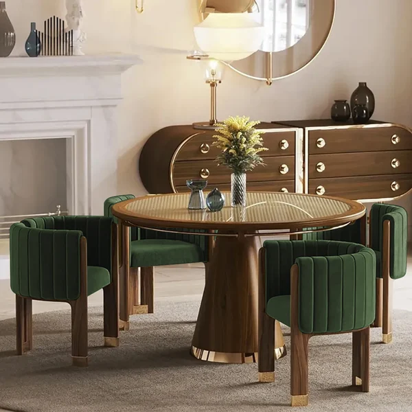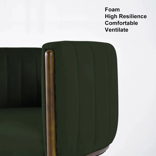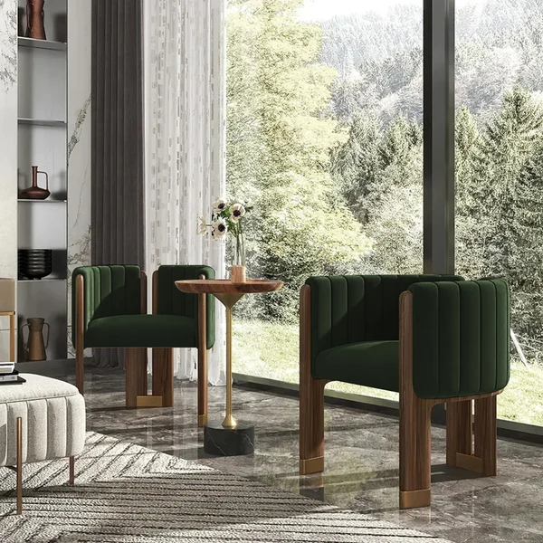 What materials are used in the modern chair? The chair is made of natural wood, with a backrest and seat padded with high-quality compressed foam, and features soft velvet fabrics.