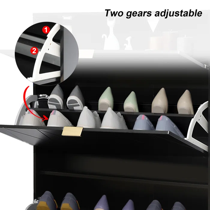 2. 2 flip-out drawers, each with a movable shelf for controlling storage space.