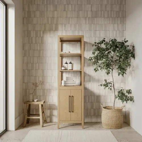 Add a classic, contemporary touch to your bathroom with the Segal natural wood cabinet, which combines practical elegance with aesthetic design. This cabinet is the perfect choice for organizing your everyday items, offering ample storage space in a compact, attractive design. The cabinet features two closed doors for storing personal items and towels, while open shelves allow you to display toiletries and decorative items.