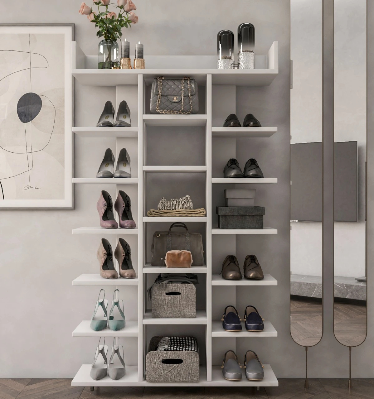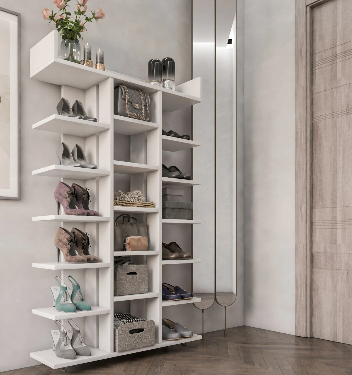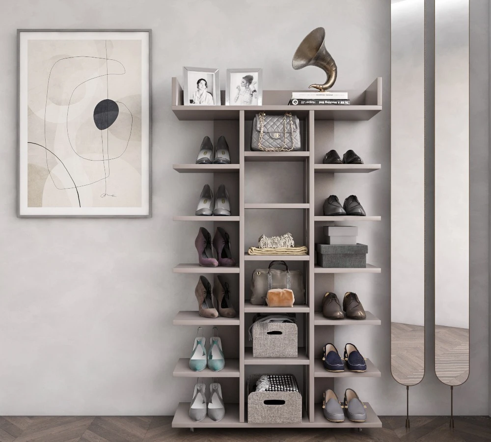 تحتوي الوحدة على أرفف متعددة تسهل ترتيب حتى 15–20 زوج من الأحذية، بالإضافة إلى إمكانية استخدامها كجزامة دولاب أو خزانة تخزين لعرض الكتب والمقتنيات.