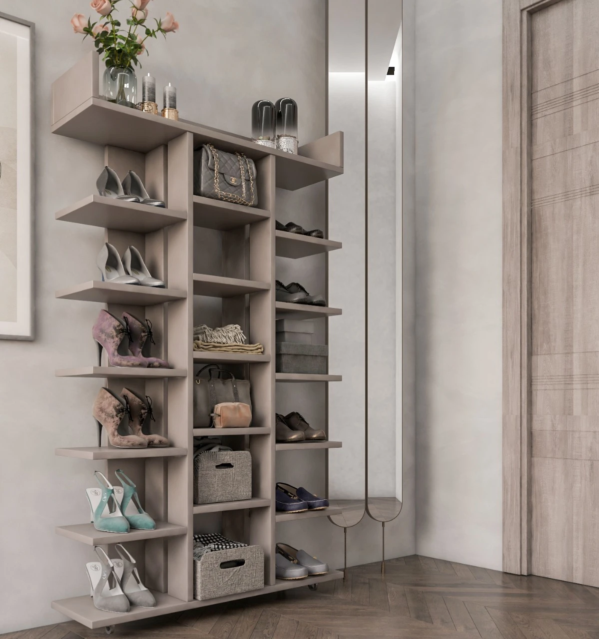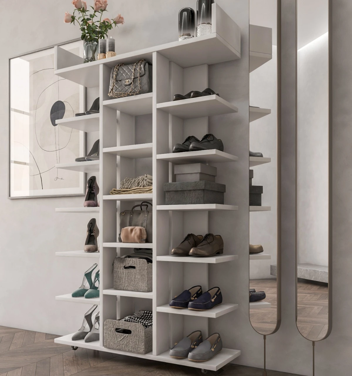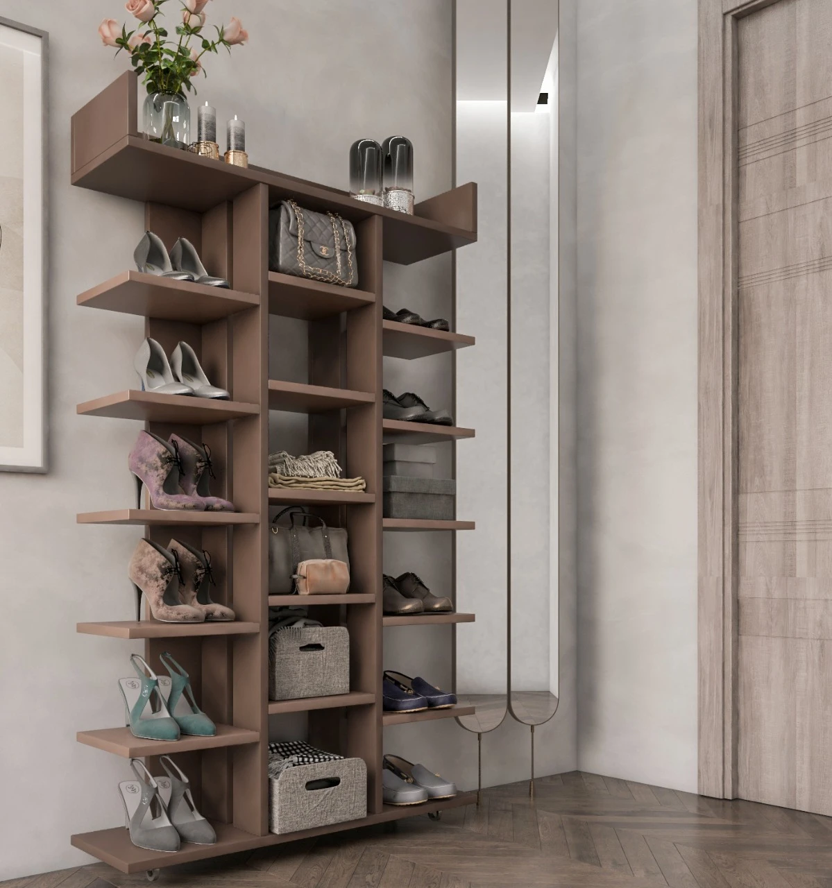 تحتوي الوحدة على أرفف متعددة تسهل ترتيب حتى 15–20 زوج من الأحذية، بالإضافة إلى إمكانية استخدامها كجزامة دولاب أو خزانة تخزين لعرض الكتب والمقتنيات.