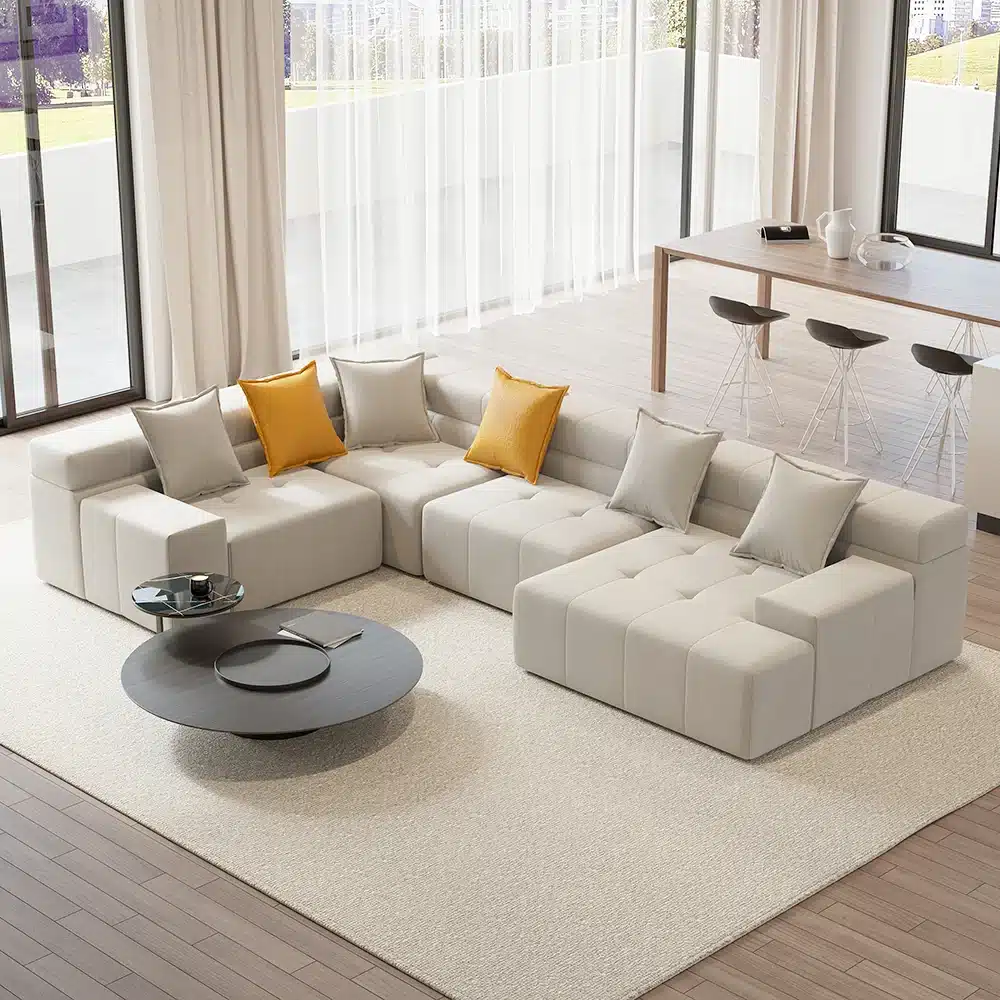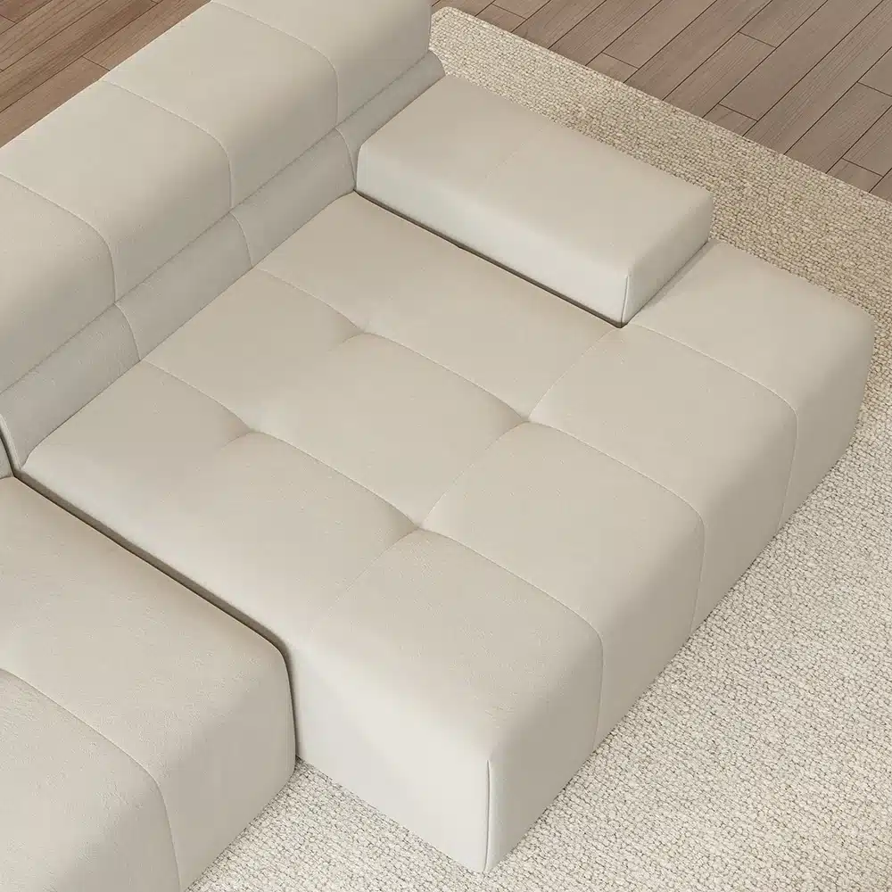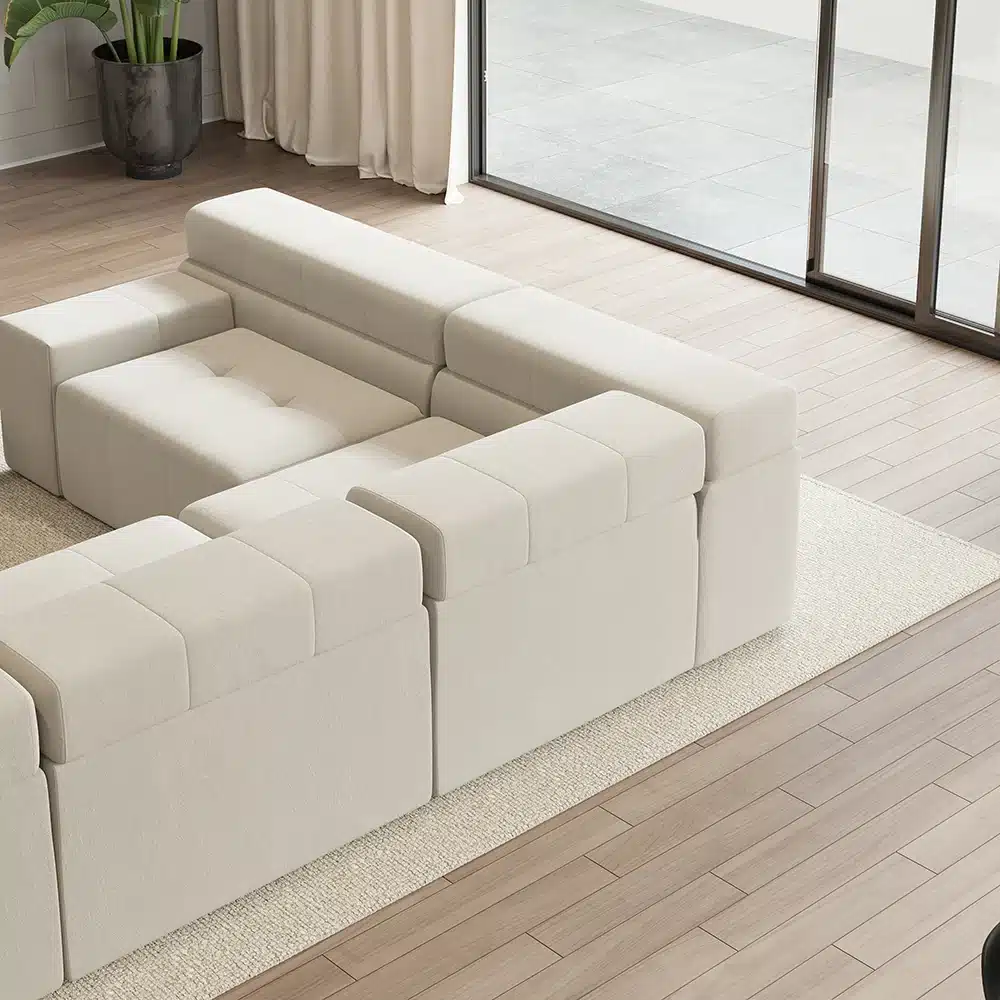 تمتع بمتعه الجلوس و الراحه مع اريكه ساندرا بفضل تصميمها المعياري ,تتكون من أربع قطع على شكل حرف L .يمكن ترتيبها بطريقتك الخاصه .تحتوى على مقاعد كبيره ومسند كبير مع خدديات من الفايبر الناعم و ملفوفة بالمخمل المتين للحصول على مقعد مريح .