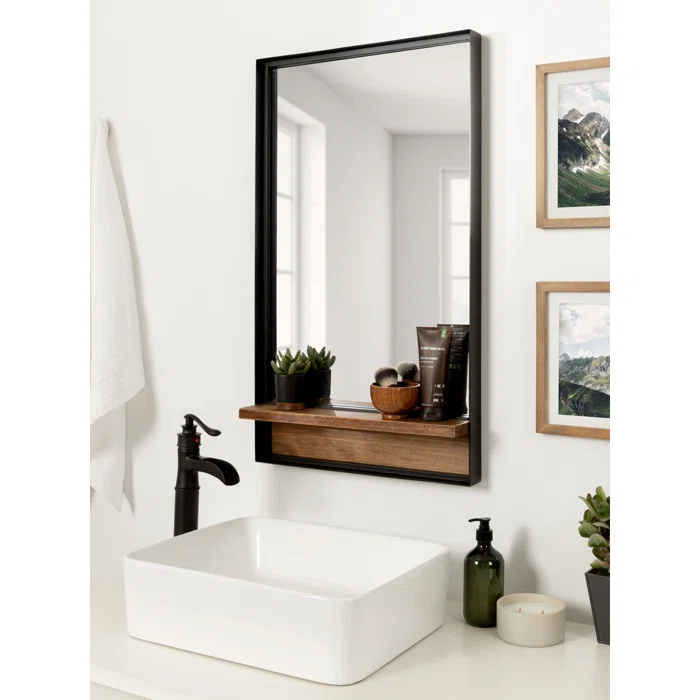 • مزيج من المرآة الكبيرة والرف الخشبي: تعكس مساحة أكبر وتوفر لك مكانًا إضافيًا لتخزين أغراضك اليومية.