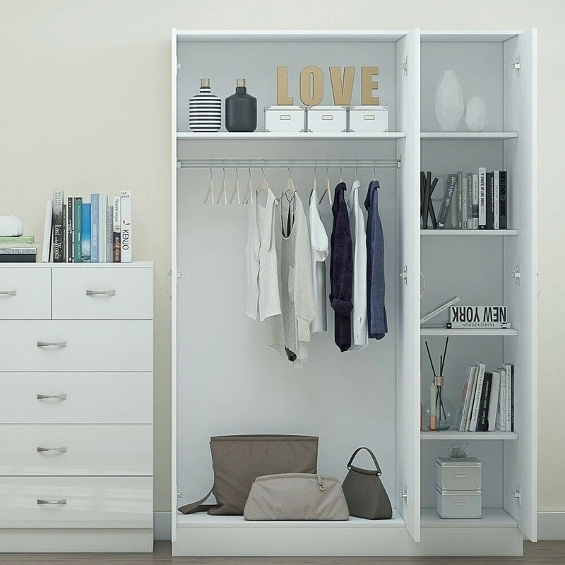 تخزين منظم: التكوين الداخلي يحتوي على سكة للتعليق لتخزين الملابس بطريقة منظمة، بالإضافة إلى رف في الباب المزدوج و خمسة أرفف خلف الباب الأيمن لتخزين الأحذية والفساتين والإكسسوارات.
