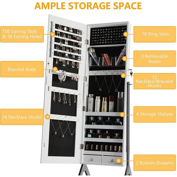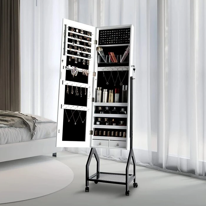 خزانة متعددة الاستخدام تحتوي على مرآة طويلة لتفقد مظهرك وتضفي لمسة من الرقي. توفر سعة تخزين كبيرة لمجوهراتك، إكسسواراتك، ومستحضرات التجميل. كما أن أربع عجلات تسهل تحريكها والوصول إلى كل ما تحتاجه.