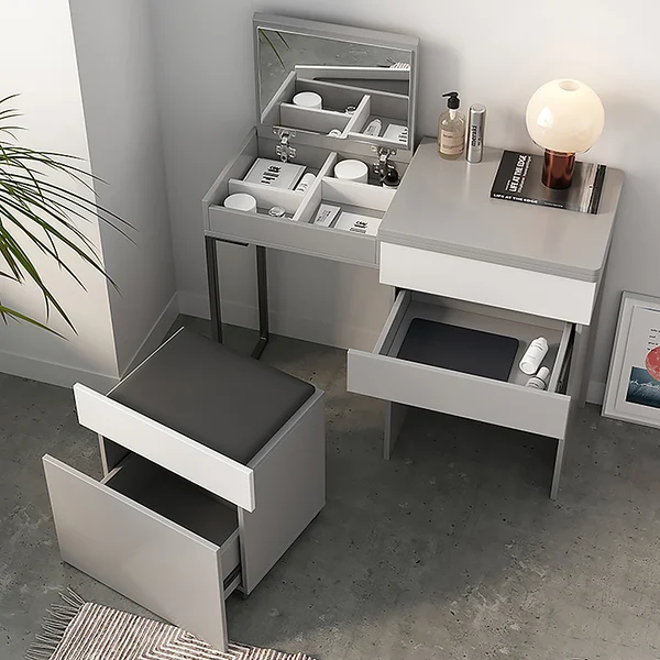 • مساحة تخزين عمليةمزودة بأدراج ومساحات داخلية تساعدك على تنظيم أدوات التجميل، المجوهرات، والملحقات بشكل منسق.