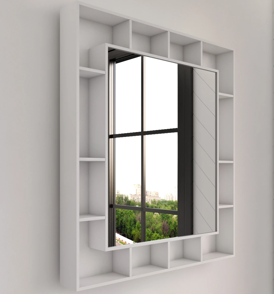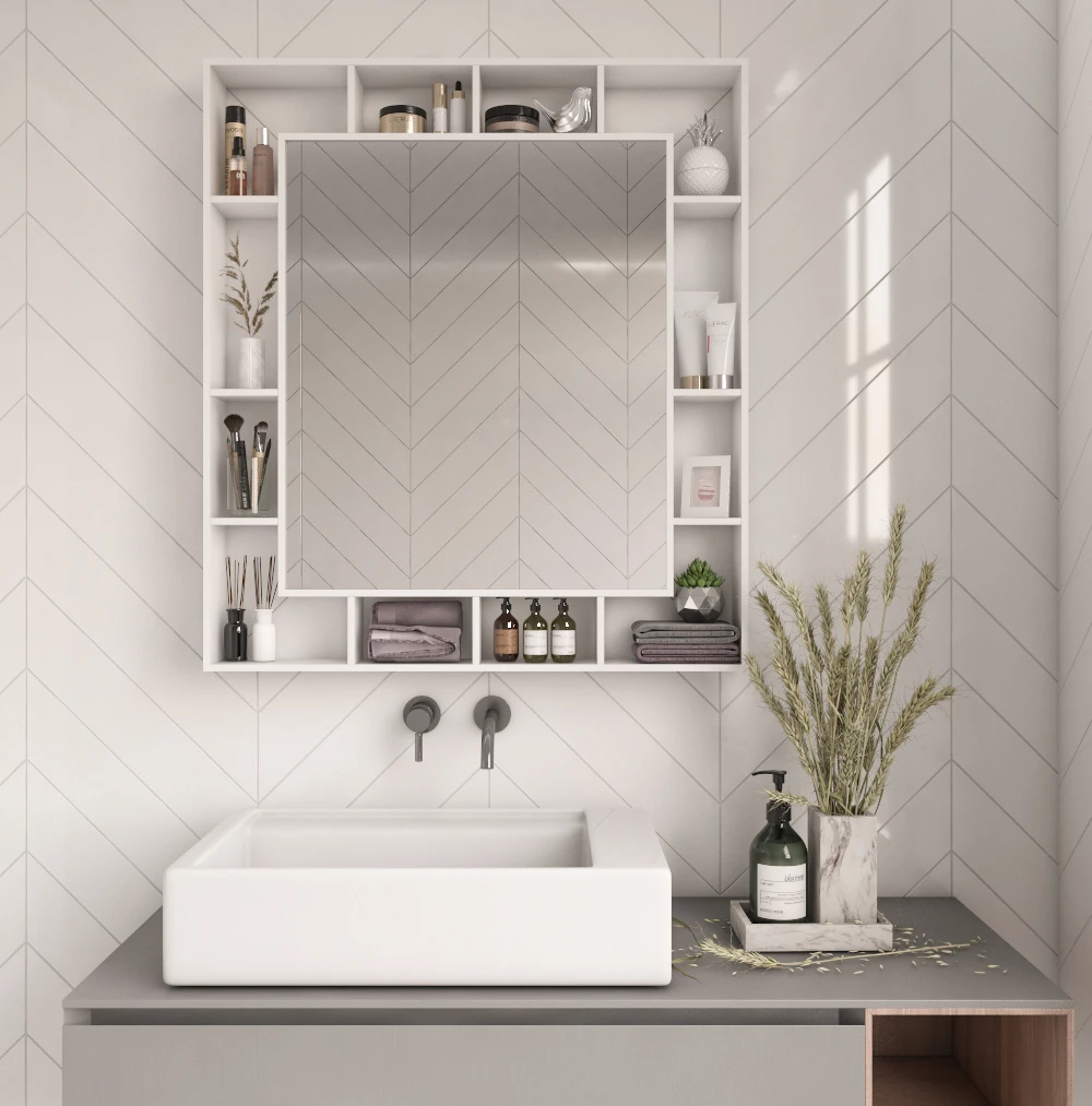 • مساحة تخزين عملية بفضل الأرفف المحيطة بالمرآة توفر الرفوف المحيطة بالمرآة مساحة تخزين إضافية تساعدك في تنظيم أغراضك الشخصية مثل مستحضرات العناية والمناشف بشكل مرتب.