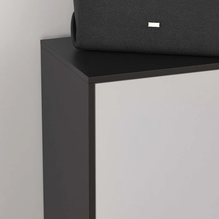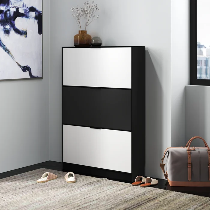 تأتي الخزانة بثلاثة أدراج قلاب، كل درج يحتوي على صفين داخليين لتخزين الأحذية بمختلف المقاسات. تم تصميمها بلوني الأبيض والأسود لإضفاء طابع عصري يناسب جميع أنواع الديكورات الداخلية. ويُعد سطحها العلوي المثالي لعرض الإكسسوارات أو الأشياء اليومية.
