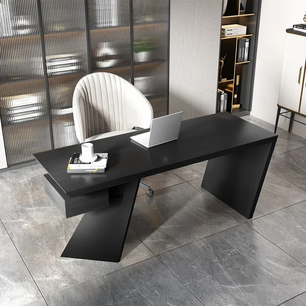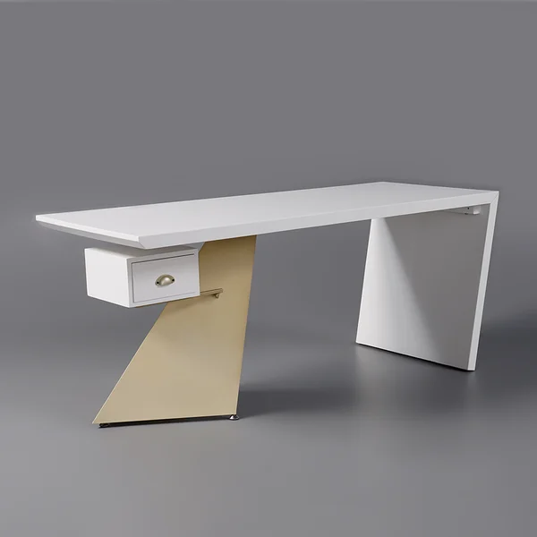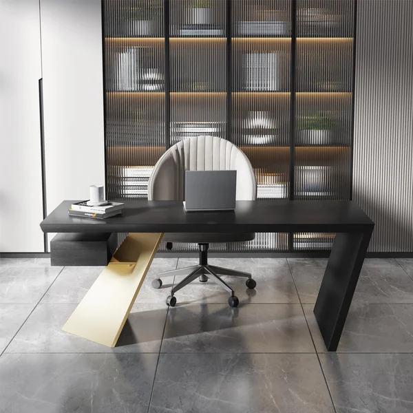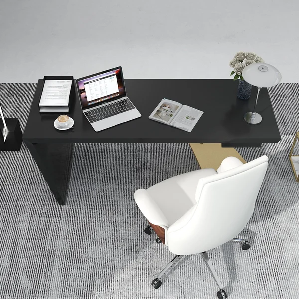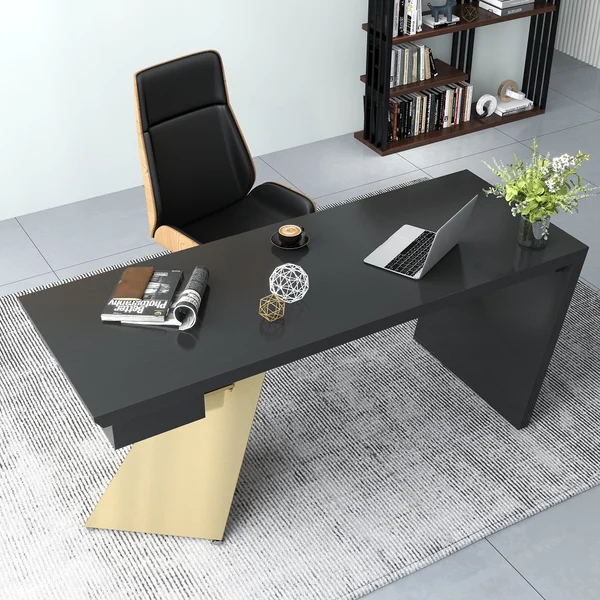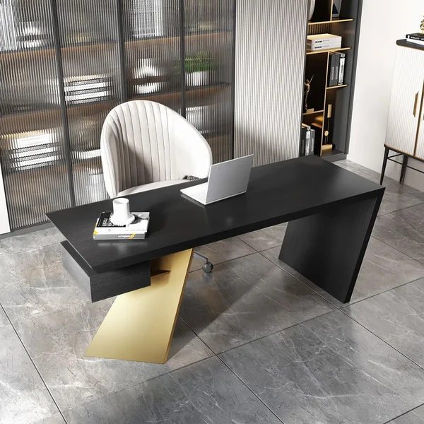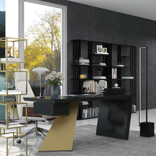 استمتع بمكتب الكتابة المذهل لإضافة لمسة من التطور إلى بيئة العمل المكتبية. باعتبارها القطعة المركزية في ديكور المكتب، فإن الإطار الهندسي لهذه الطاولة باللون الذهبي اللامع والأسود جنبًا إلى جنب يمنح تصميمًا جذابًا.