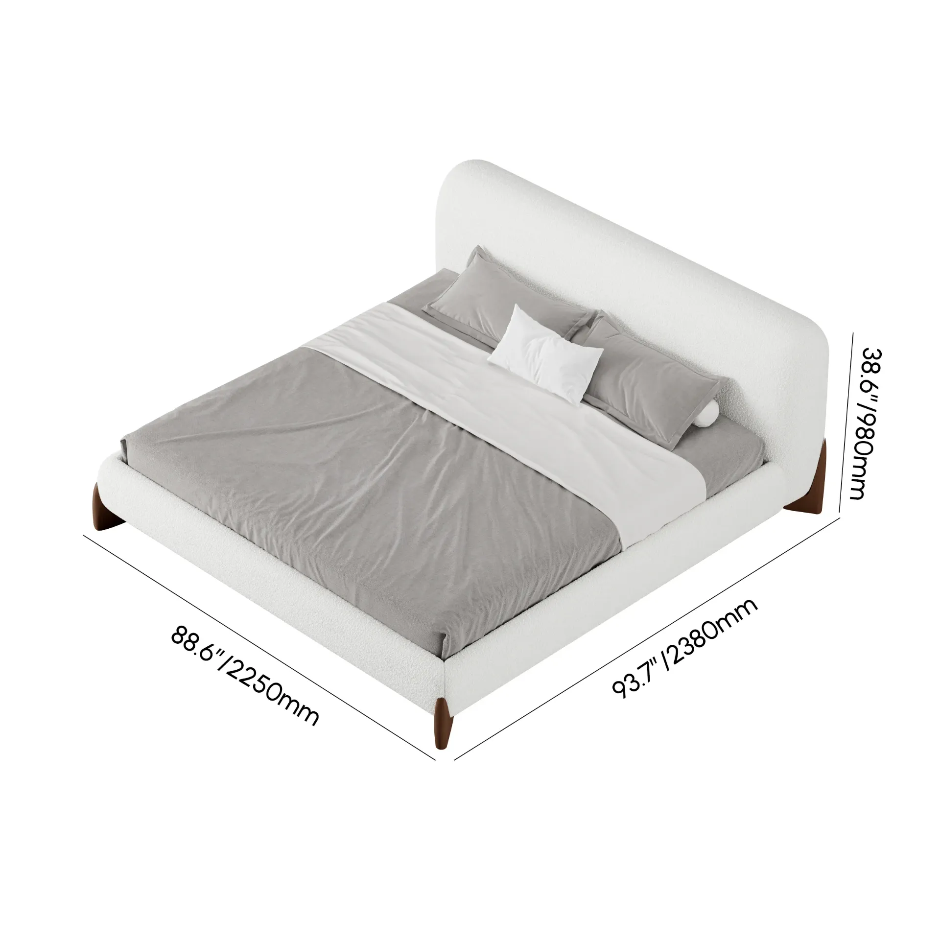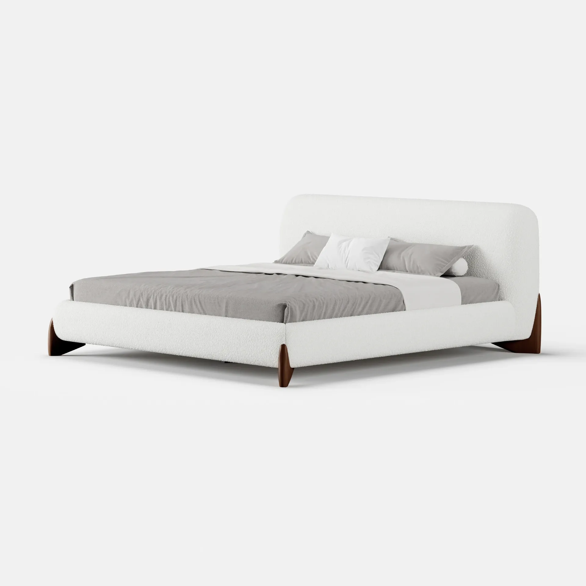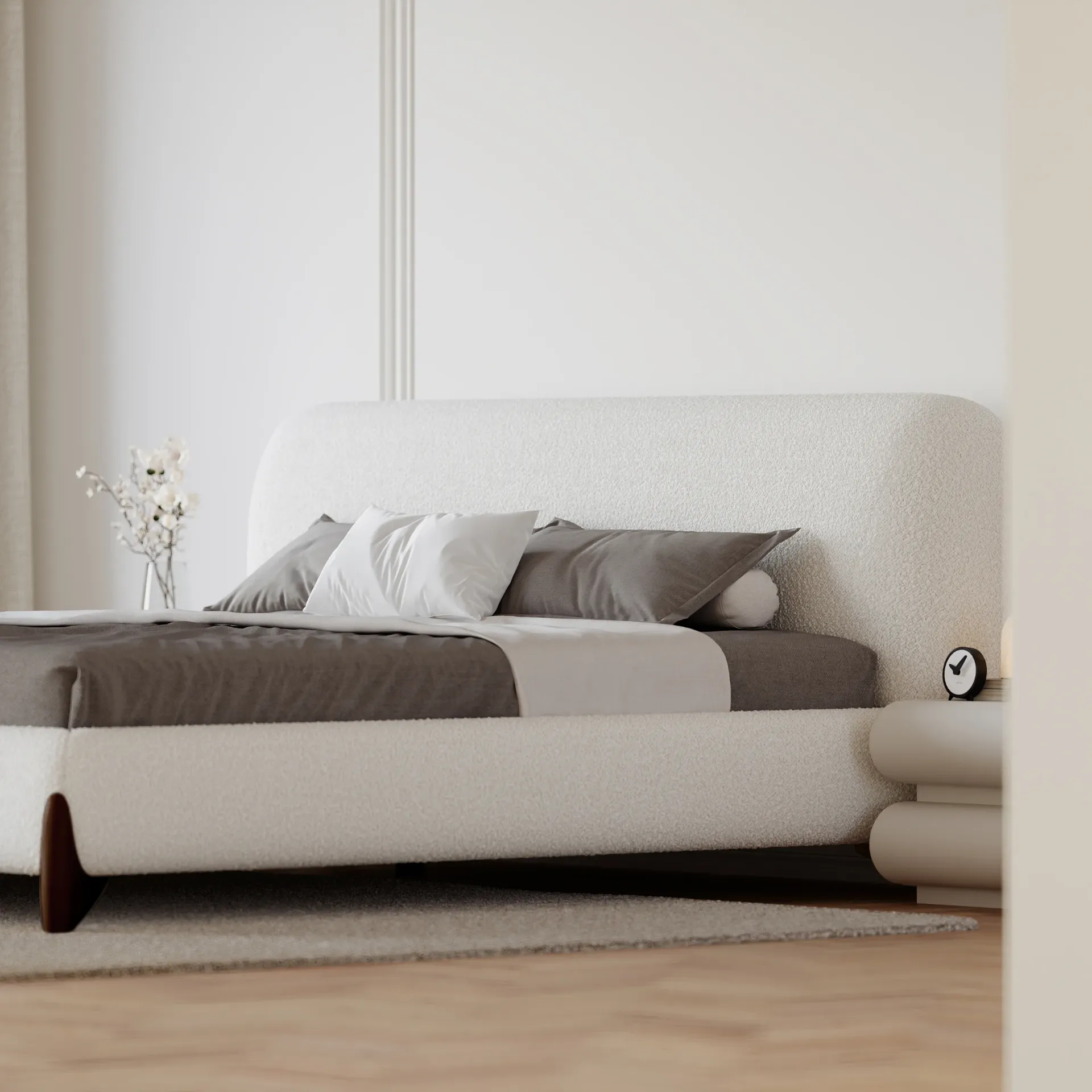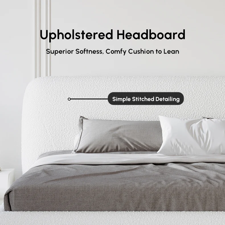 مصنوع من هيكل خشبي صلب لضمان المتانة، ومُغطى بالكامل بقماش بوكل Bouclé الناعم مع حشوة فوم عالية الكثافة لتوفير تجربة نوم مريحة وراقية كل ليلة.