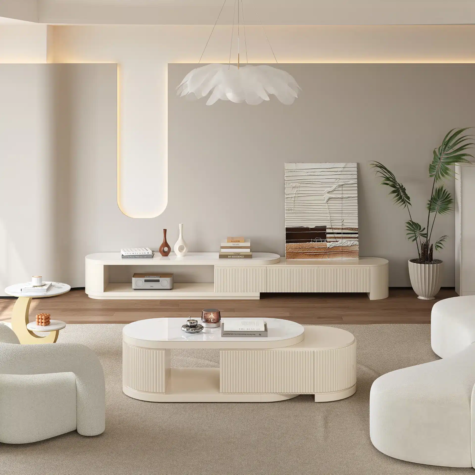 تتميّز وحدة التلفزيون القابلة للتمديد بإمكانية التعديل من 180 إلى 290 سم لتناسب مختلف المساحات، سواء كانت صغيرة أو واسعة. أما طاولة القهوة القابلة للفتح من 120 إلى 170 سم فتوفّر مرونة إضافية للاستخدام اليومي ومساحة تخزين عملية دون التأثير على جمال التصميم.