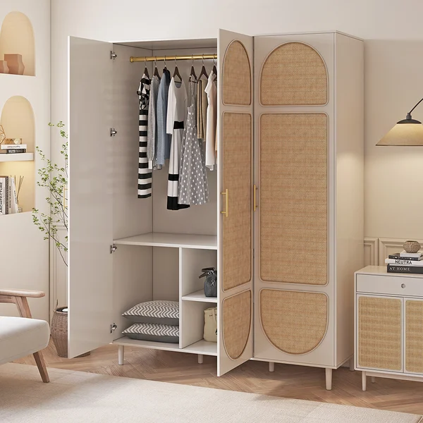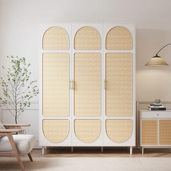 • خزانة ملابس أنيقة باللون الأبيض مصنوعة من الروطان الطبيعي تضيف طابعًا ديكوريًا فريدًا إلى الغرفة.